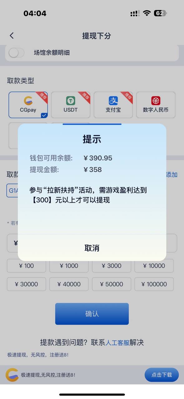 例:玩家A充值100参与领取了该活动,此时则需5倍以上盈利,即为(100+100)x5=1000即可提款