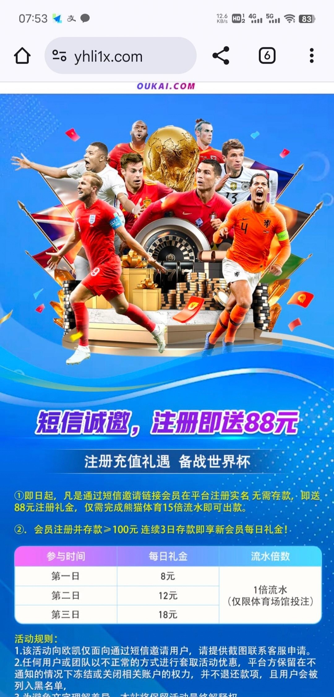 注册送88 注册找客服说领取特邀彩金,88只能打熊猫体育15倍流水,,开始还以为是黑台,结果提现秒到,应该不需要特邀,我朋友没收到短信注册也送了,必须走短信里面的链接注册才送 http://titoxs.com