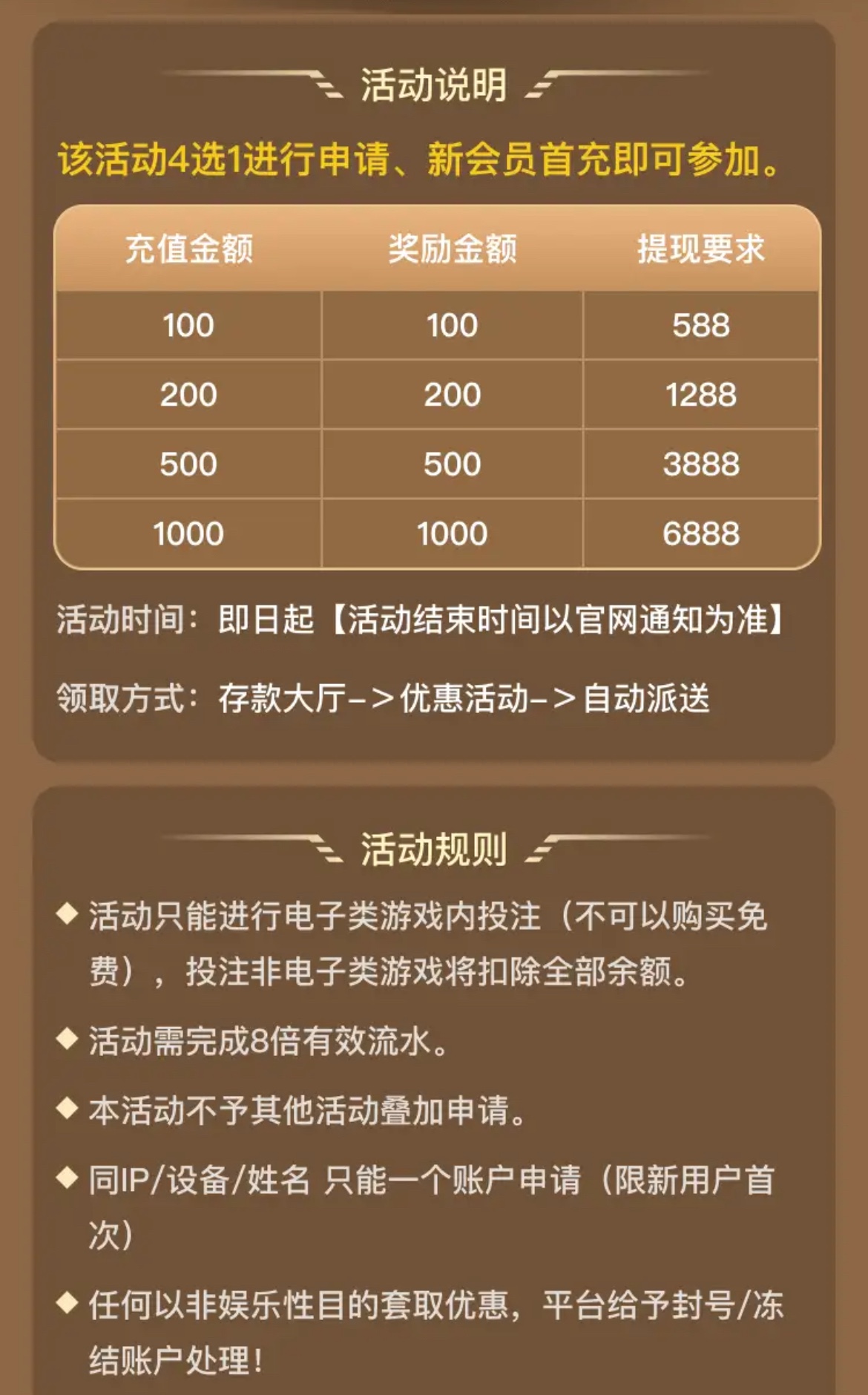 规则改了彩金出款需充值同等金额了 打上去提款没有退回的先充值100然后自动退回打3水就可以出款了
