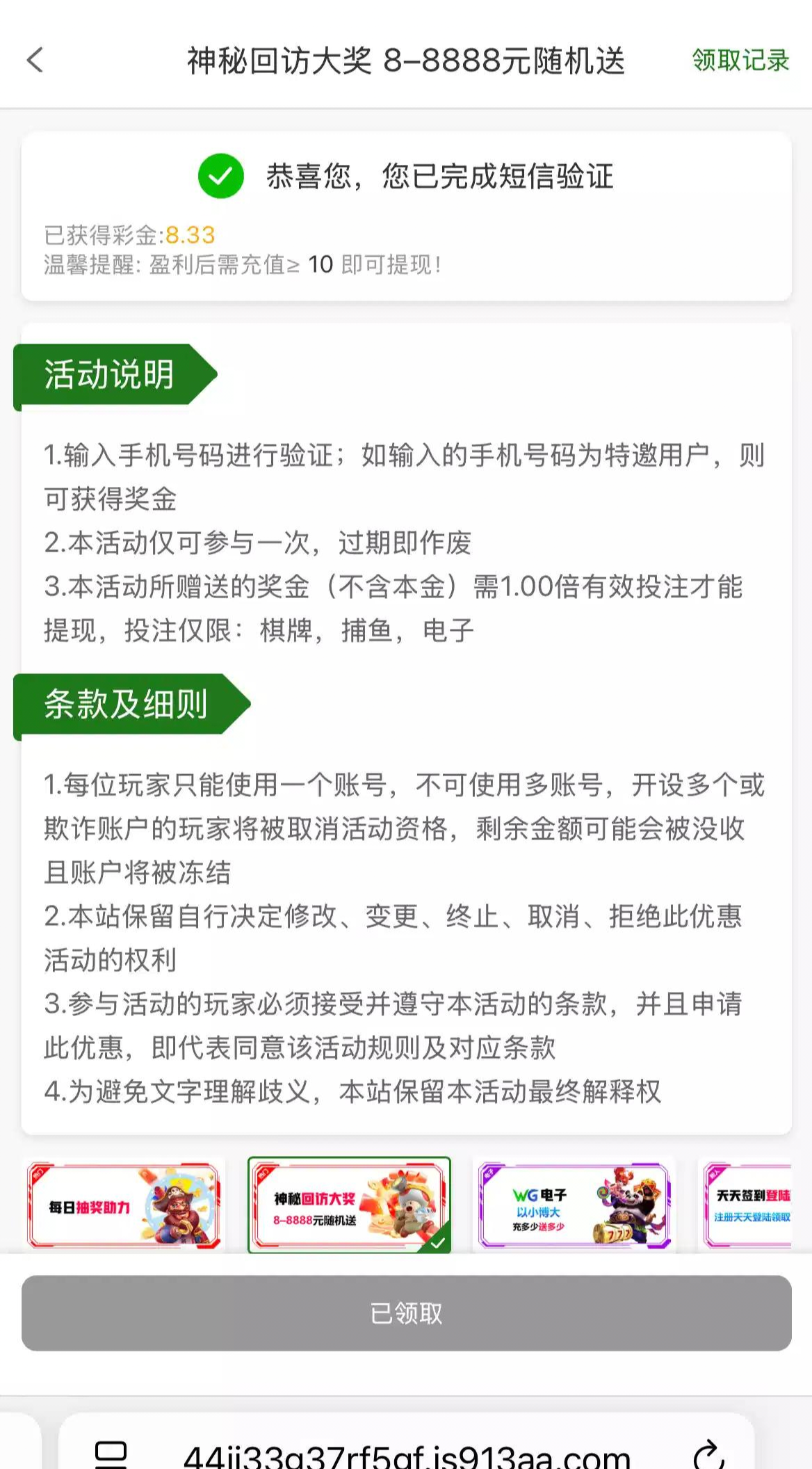 913.am,自助回访,我领了没打出来,打出来要充10,屌大的朋友上