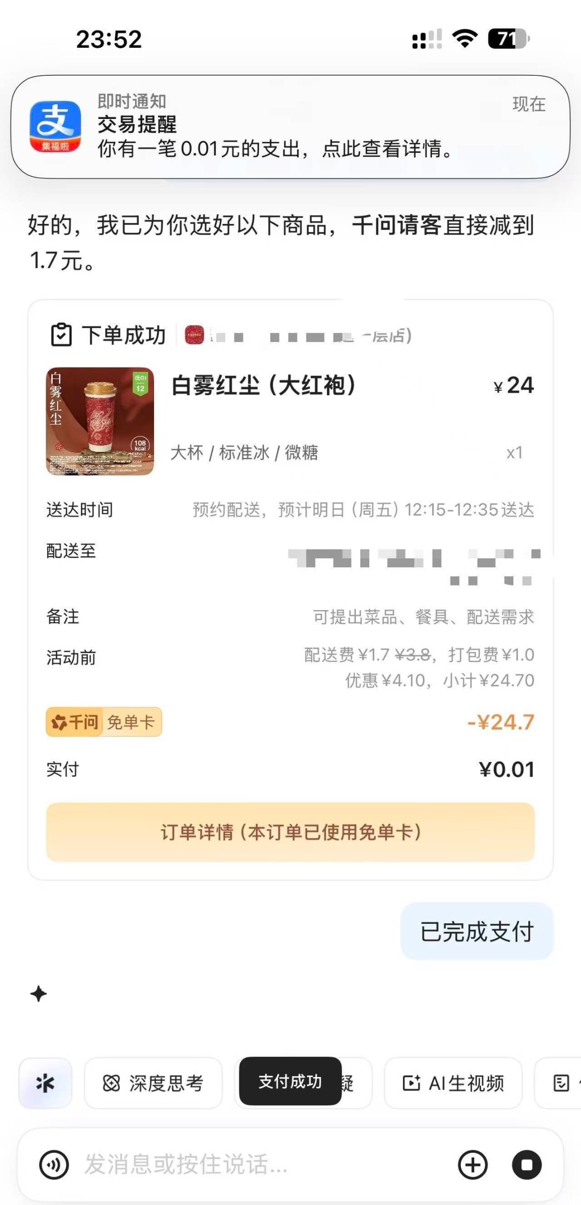【千问白嫖奶茶炸鸡汉堡直接免单】